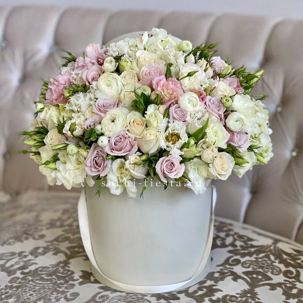 Сочетание пышной голубой гортензии и классических белых роз — это гимн нежности и чистоты. Букет, который не просто удивляет своим масштабом, но и дарит ощущение безмятежности. Идеальный выбор для самого искреннего признания.