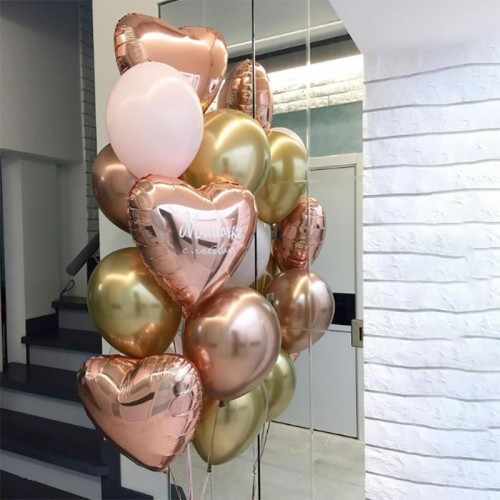 3 шт. фольгированных шара сердце розовое золото (без надписи), 3 шт. латексных нежно-розовых шара, 3 шт. хромированных золотых шаров, 2 шт. хромированных розовых шаров, грузик.