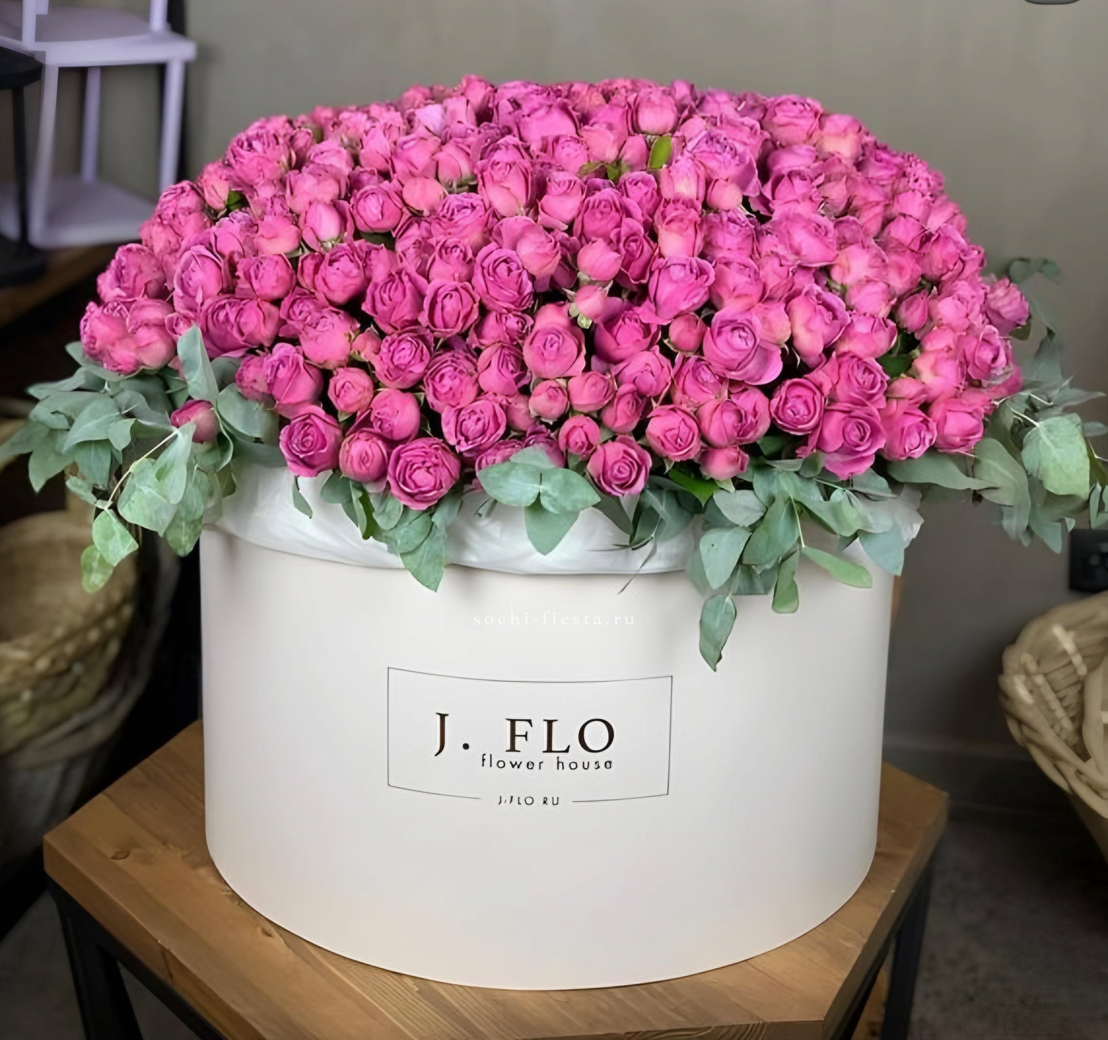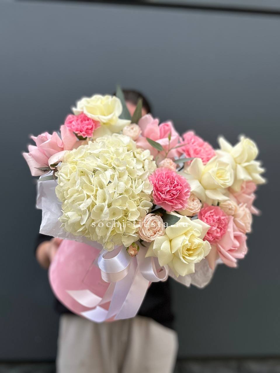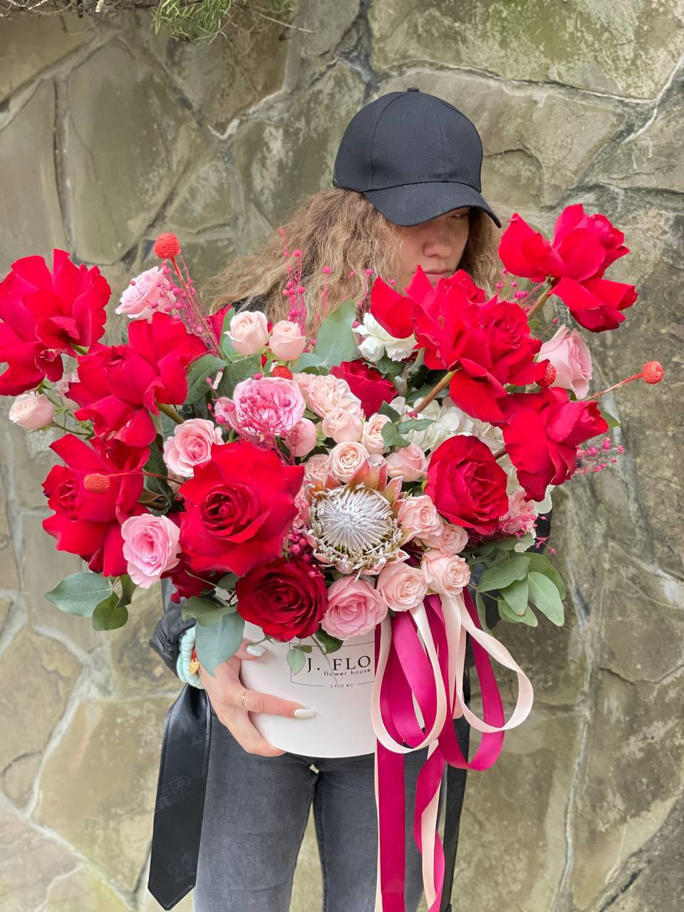 Вывернутые лепестки роз открывают внутреннюю текстуру бутонов и добавляют объема композиции. Гортензия и эустома заполняют пространство между крупными головками и создают многослойность.