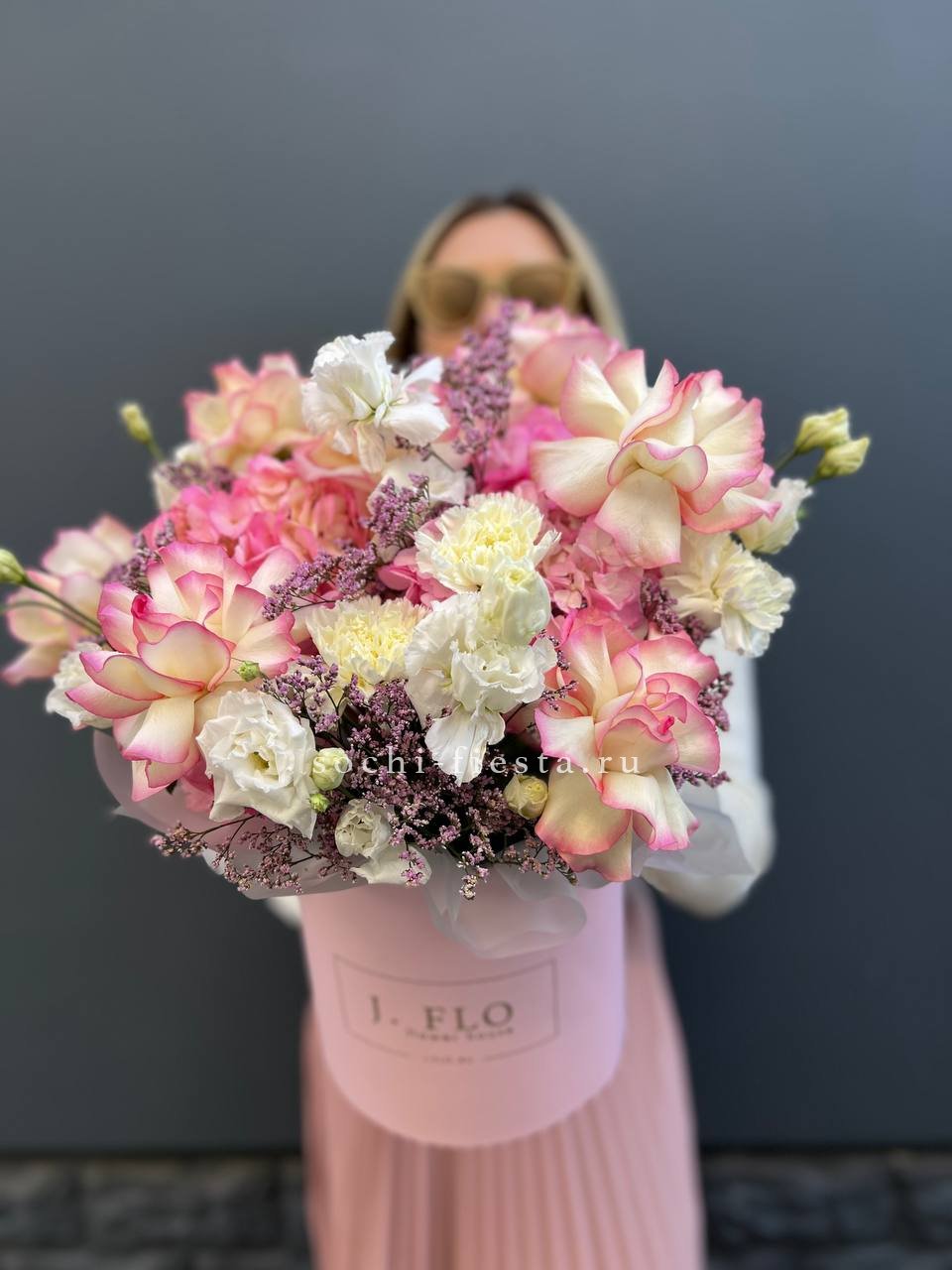 пионовидная роза сорта Мисти бабблс, эвкалипт в коробке или корзине.