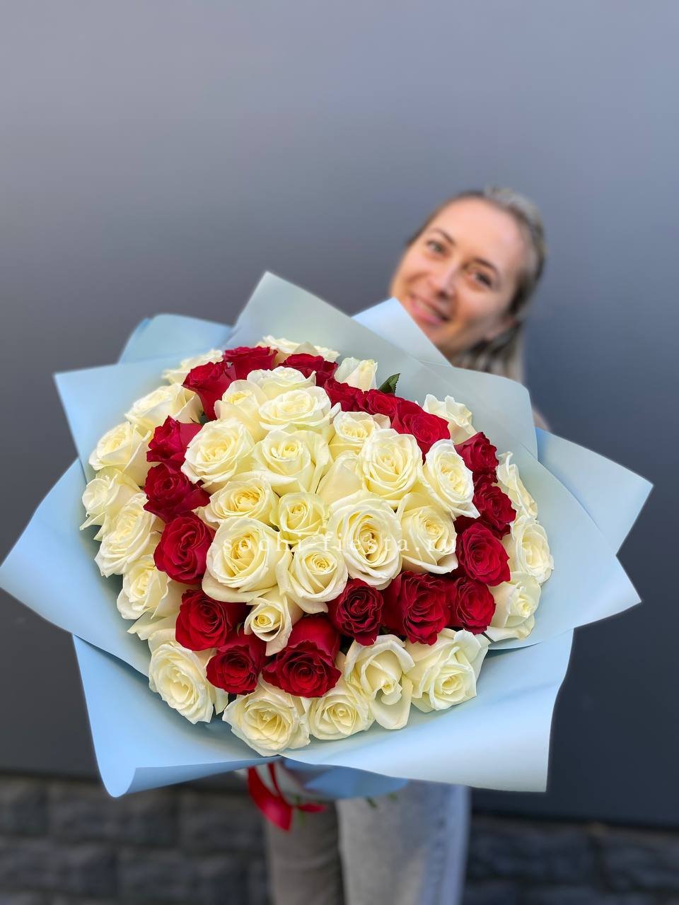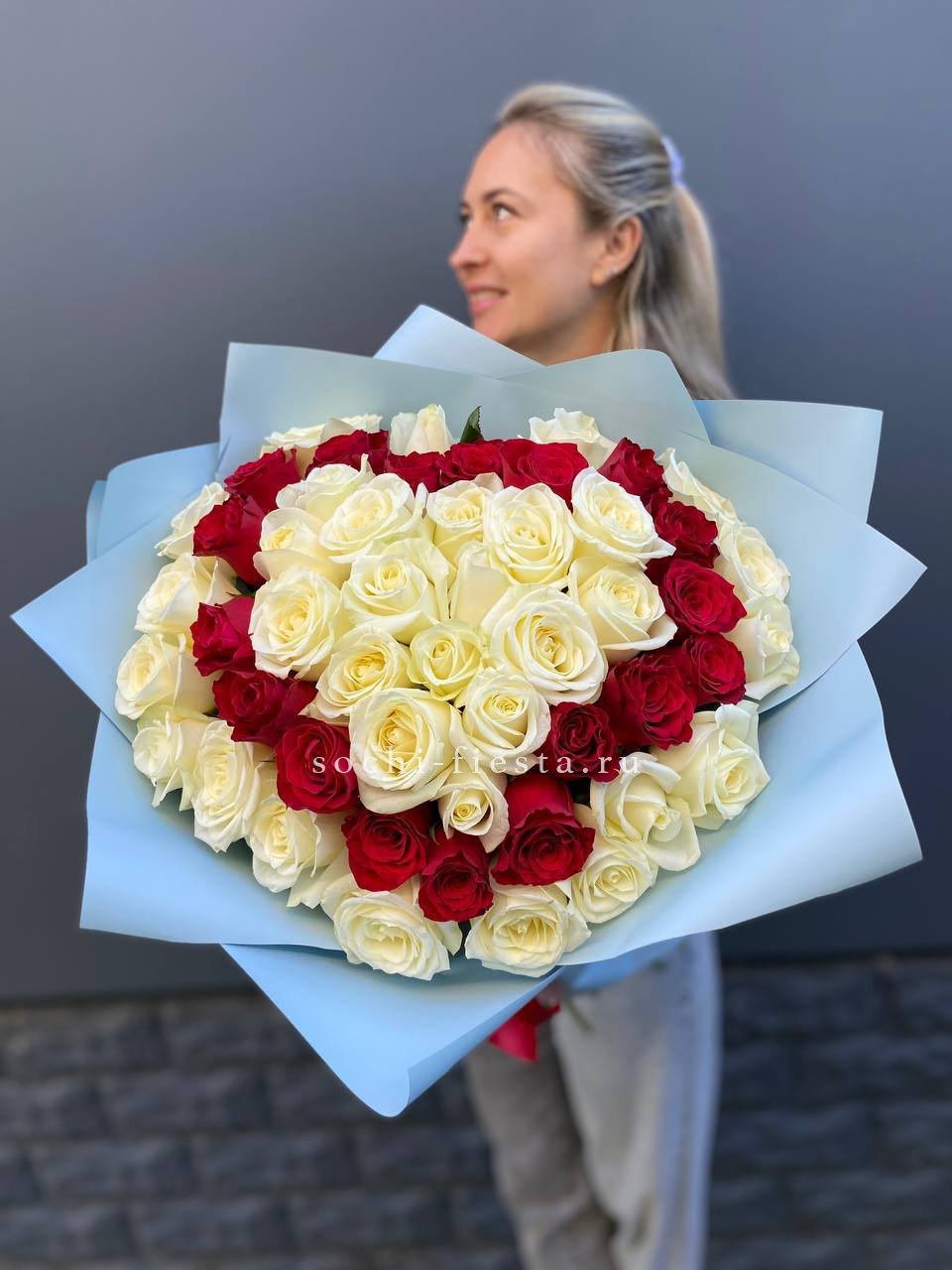 Мягкая игра оттенков между белым и розовым создает объемную глубину букета. Пятьдесят один бутон выстраивается в плотную структуру, где каждый цвет усиливает звучание соседнего без резких границ.