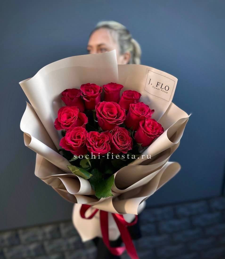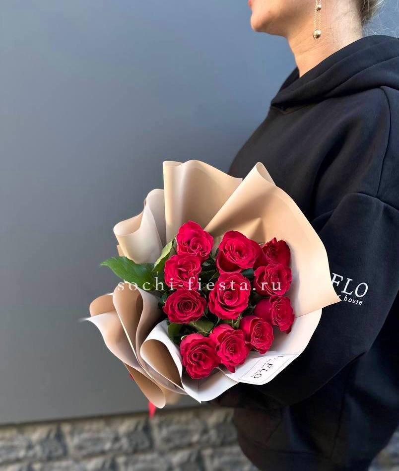 Одиннадцать роз сорта Naomi радуют глубоким красным оттенком и бархатистой поверхностью лепестков. Композиция выглядит свежо и уверенно в любом интерьере.