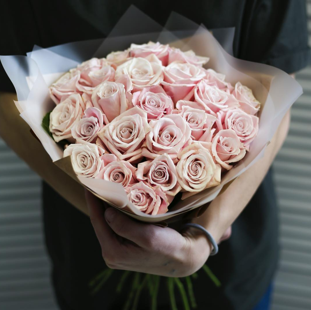 Пятнадцать роз на удлиненных стеблях выглядят графично и современно. Кремовые лепестки сохраняют свежесть и форму в течение долгого времени.