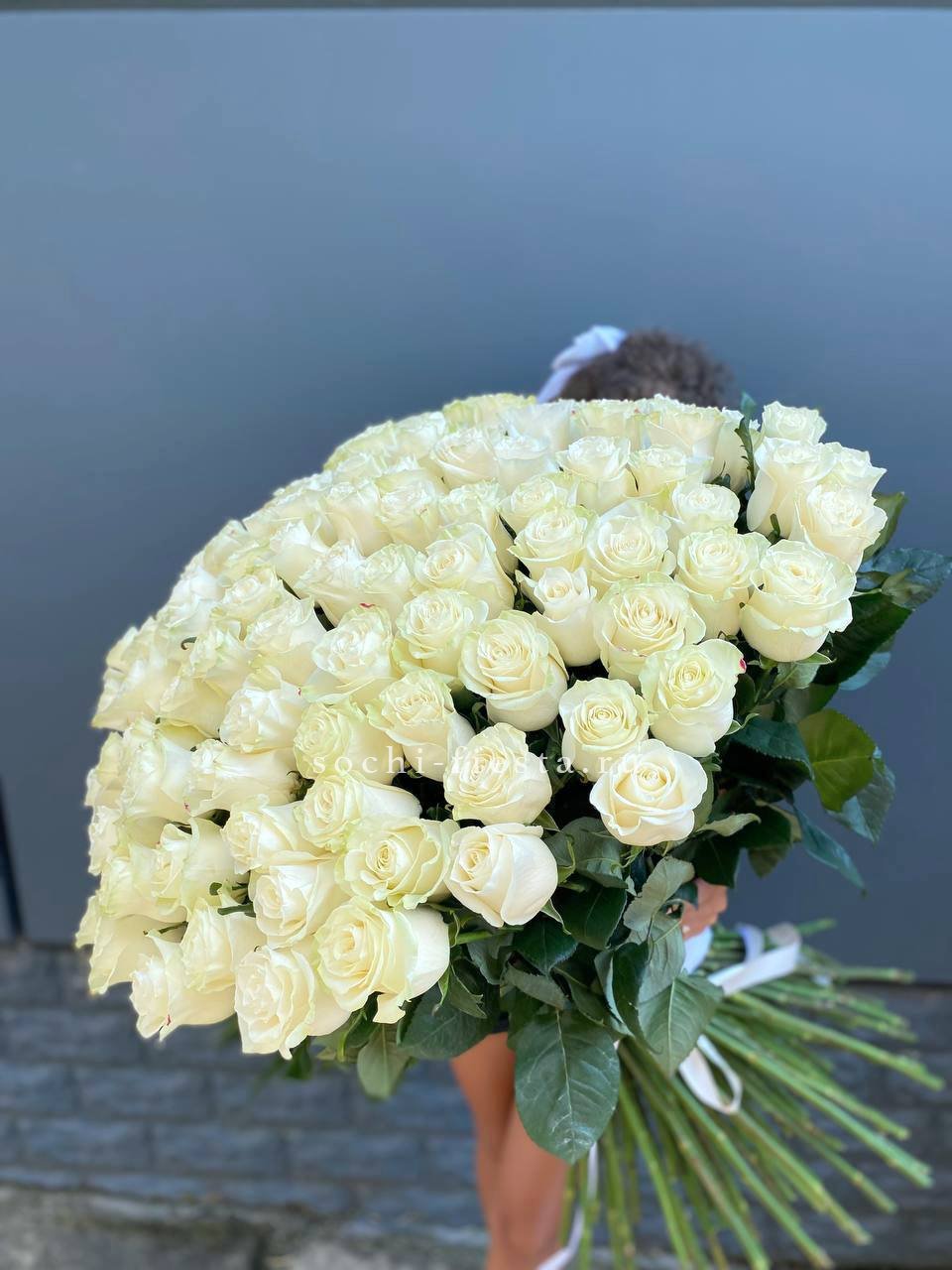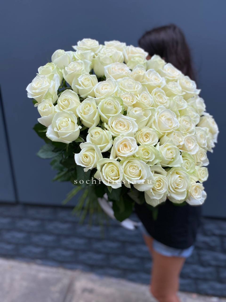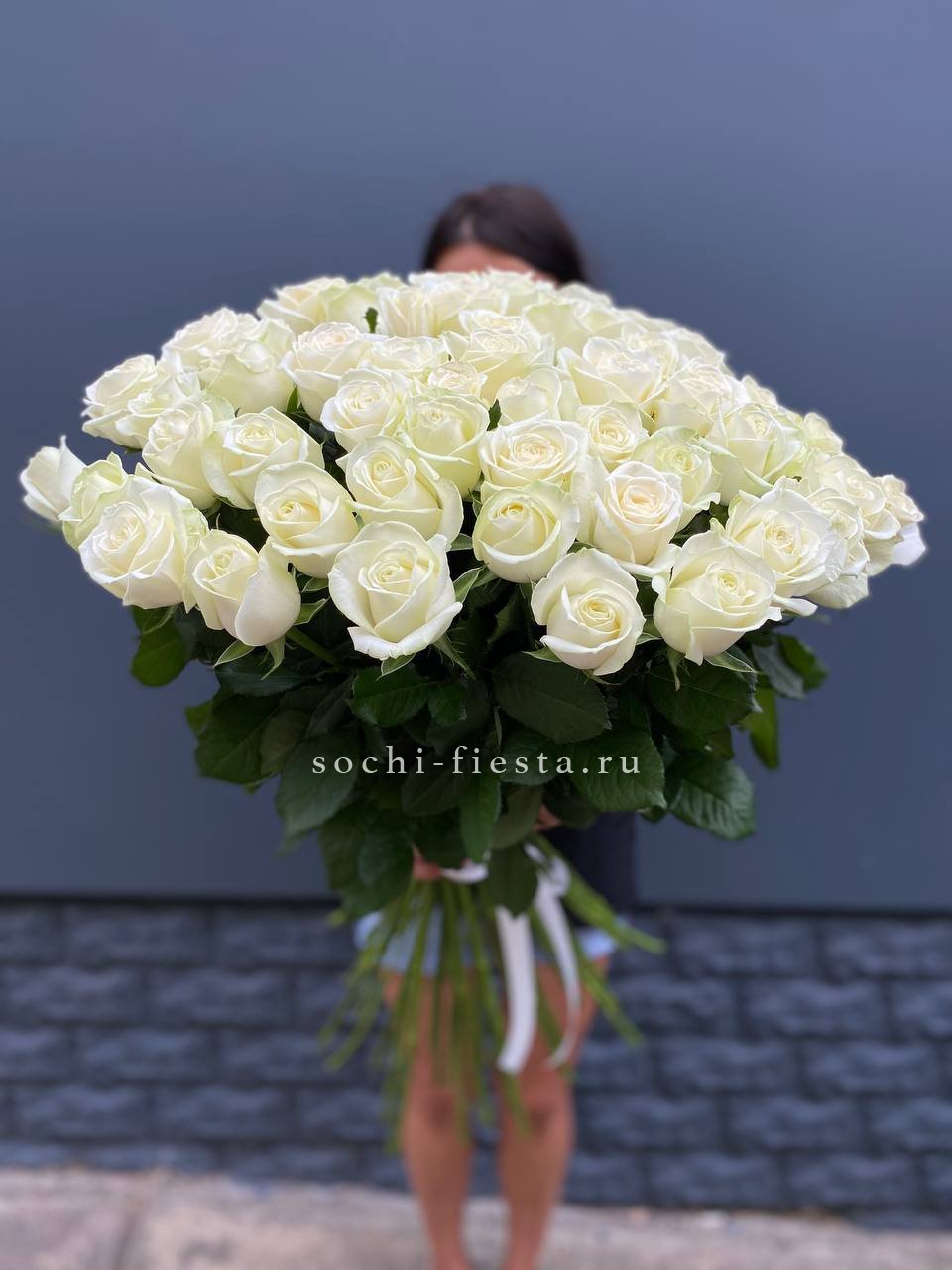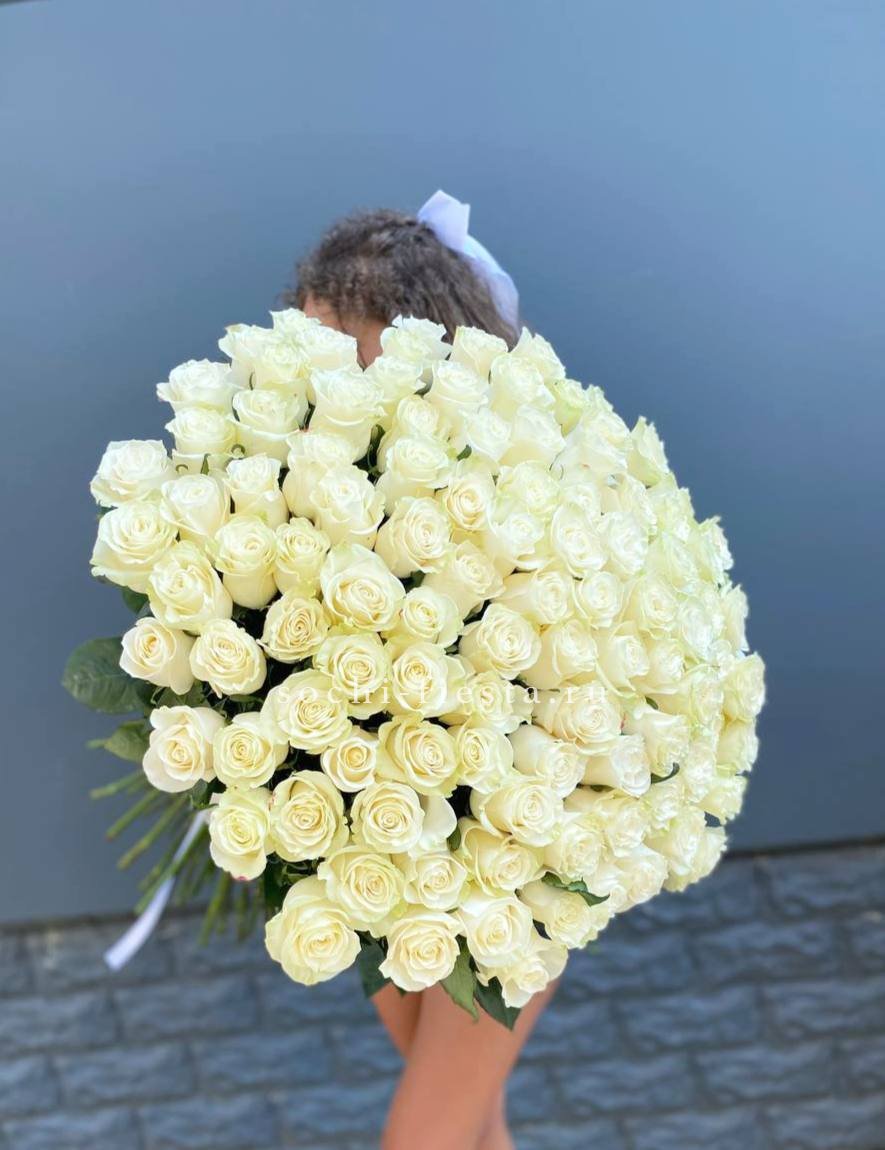 Пятьдесят один белоснежный бутон создаёт объёмное облако с мягкими переходами света и тени. Голландские розы держат форму и заполняют пространство плотной текстурой лепестков.