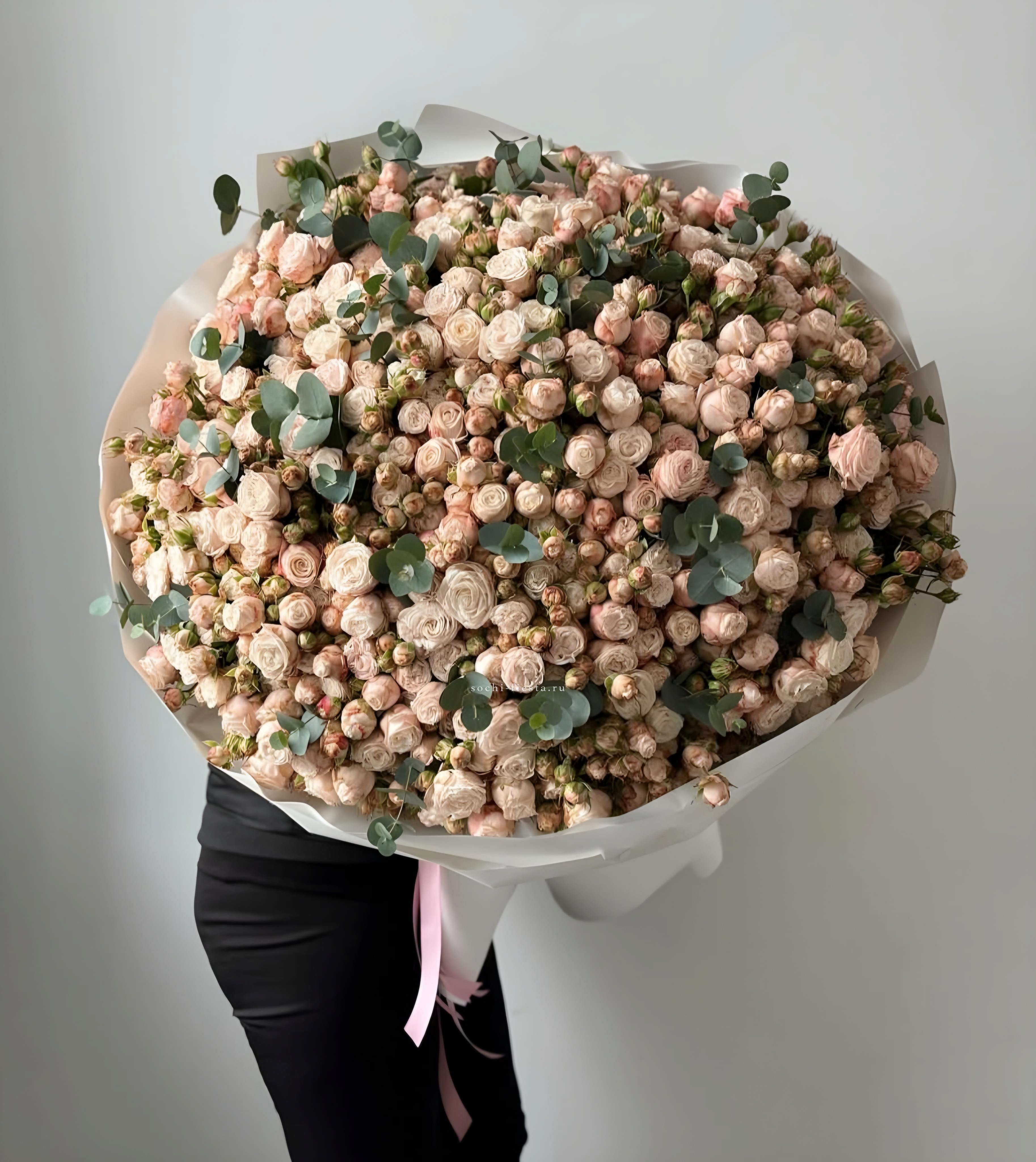 Сто один бутон Бомбастик укладывается плотными кругами в просторную корзину. Эвкалипт обрамляет композицию свежей зеленью, а пышные головки роз формируют мягкую волнистую поверхность.