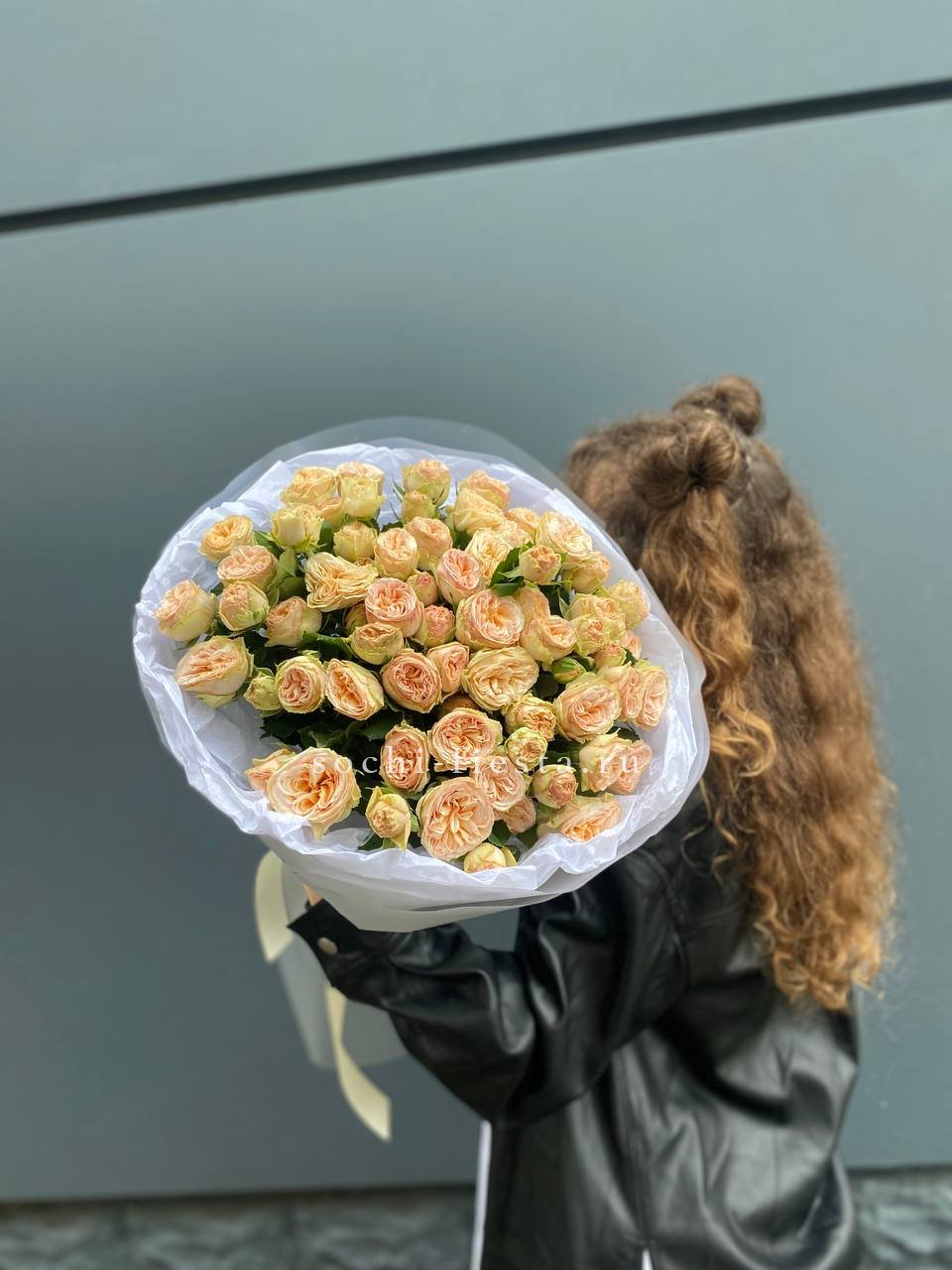 кустовая пионовидная роза, лента, дизайнерская упаковка.