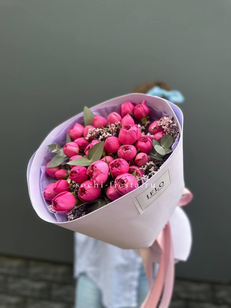 Одиннадцать бутонов с пышной структурой и едва заметным переходом от пудры к лавандовому. Лепестки раскрыты неравномерно, создавая живую текстуру и объём. Композиция держит форму и радует глаз несколько дней.